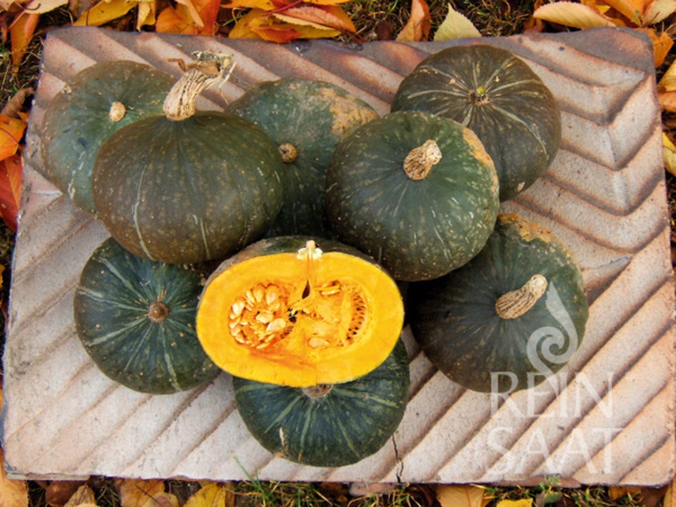 Esta variedade de abóbora trepadeira produz frutos redondos e largos com polpa firme e amarela, que são descritos como as joias entre as abóboras devido ao seu sabor fino, semelhante a nozes. A casca verde-escura também é adequada para consumo.