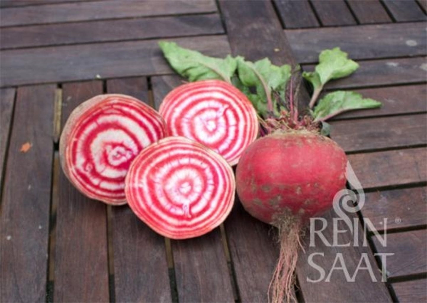 Esta variedade especial produz tubérculos uniformemente redondos, de cor vermelho-claro, com anéis vermelhos e brancos marcantes no corte transversal e um sabor muito fino, suave e ligeiramente adocicado, sendo ideais para carpaccio de beterraba. A folhagem desta planta é relativamente curta e verde-clara.