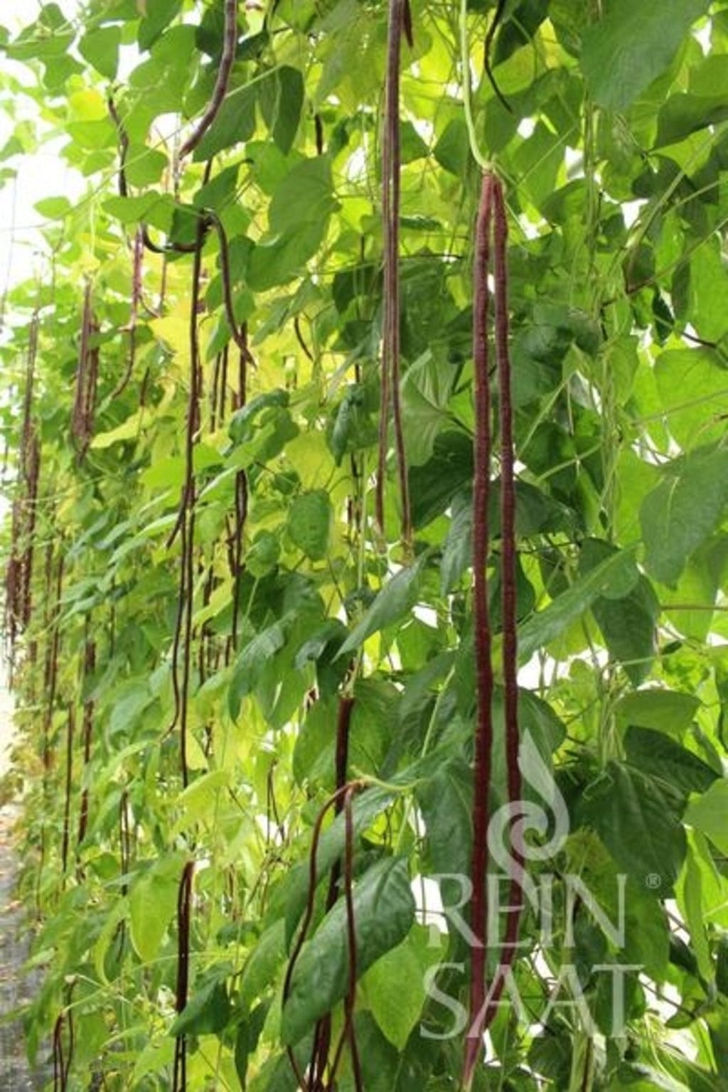 Esta variedade de crescimento vigoroso produz vagens vermelho-violeta com até 50 cm de comprimento, que perdem a cor durante a cozedura e, quando colhidas jovens, ainda não têm fios.