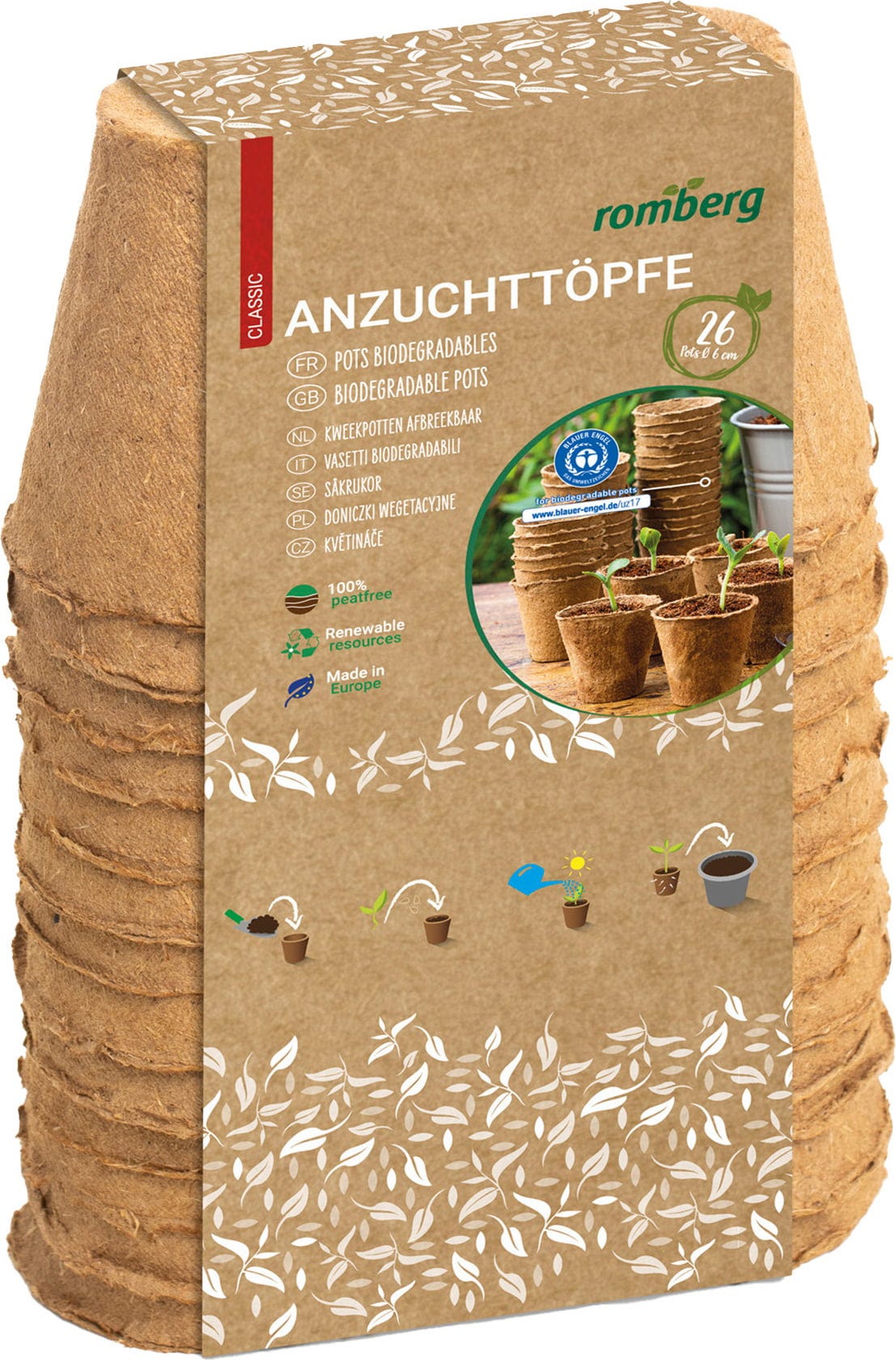 Os vasos de cultivo da Romberg são isentos de aditivos químicos e biodegradáveis. Ideal para um cultivo de plantas bem-sucedido de forma sustentável. A planta pode ser plantada diretamente no solo com o vaso. Utilizável para a propagação por sementes, para a repicagem de pequenas plântulas e para o cultivo de estacas.