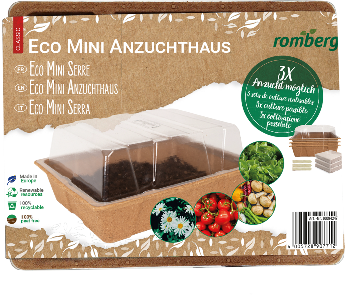 Com o Conjunto de Estufa ECO MINI, começas o cultivo de plantas de forma sustentável! O conjunto contém três tabuleiros de celulose biodegradáveis, bem como uma tampa, responsável pelo microclima ideal. A terra incluída garante um crescimento ideal e, para uma identificação fácil das tuas plantas, existem três etiquetas de madeira.