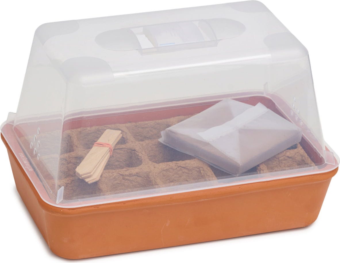 Com o conjunto completo de miniestufa Romberg, as plantas podem ser cultivadas de forma ideal em espaços pequenos. A bandeja de terracota que retém o calor garante um clima uniforme, enquanto a cúpula inquebrável proporciona proteção e estabilidade. Vasos de celulose biodegradáveis, substrato e etiquetas de madeira tornam o conjunto sustentável e completo. Ideal para varandas, parapeitos de janelas ou pequenos jardins – assim, o início da época de jardinagem torna-se uma brincadeira de crianças!