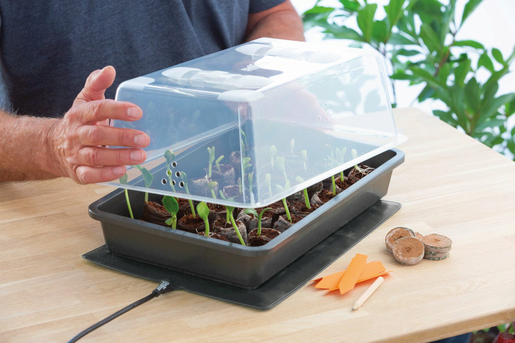 O conjunto é composto por um tabuleiro de cultivo (antracite) com cavidades, uma cobertura transparente com regulador de ventilação e um tapete de aquecimento (35 x 25 cm) com uma potência de 17,5 watts.