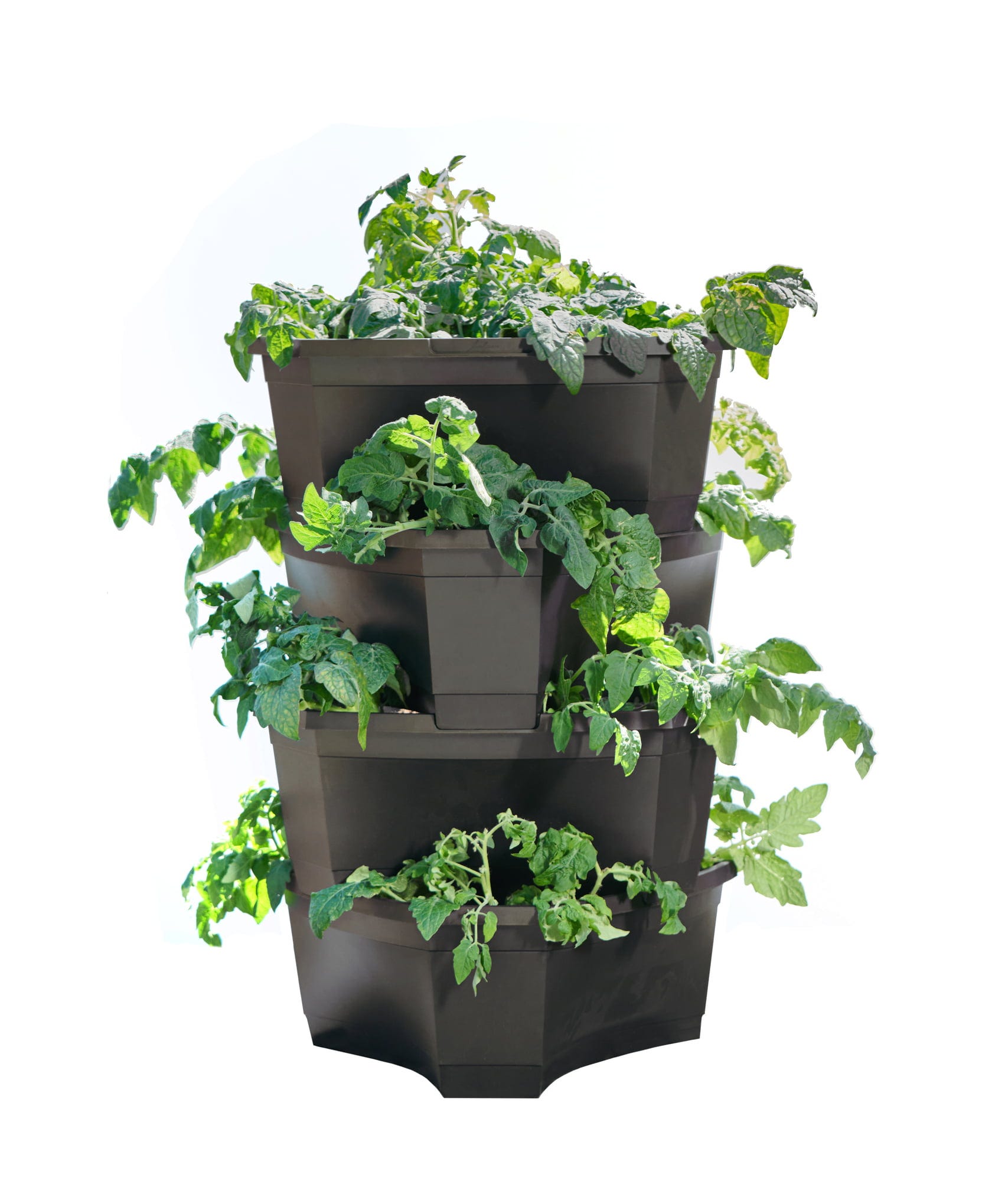 - Torre de batatas e plantas composta por quatro vasos individuais com furos de drenagem
