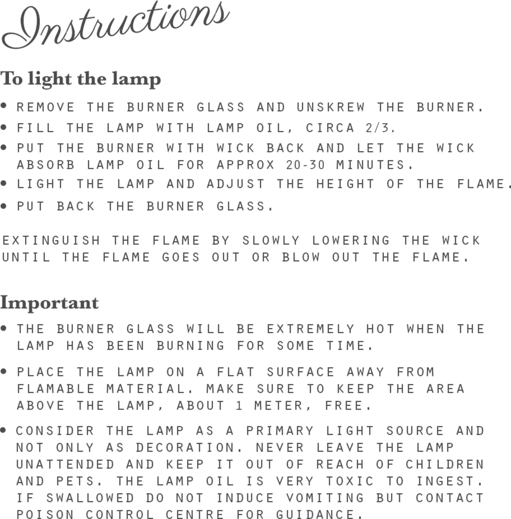 Este modelo elegante apresenta tons de Branco e Dourado. O depósito de Vidro é enchido com um Óleo de Iluminação especial. O pavio é aceso e, com a ajuda da pequena roda lateral, podes regular a intensidade da Luz.