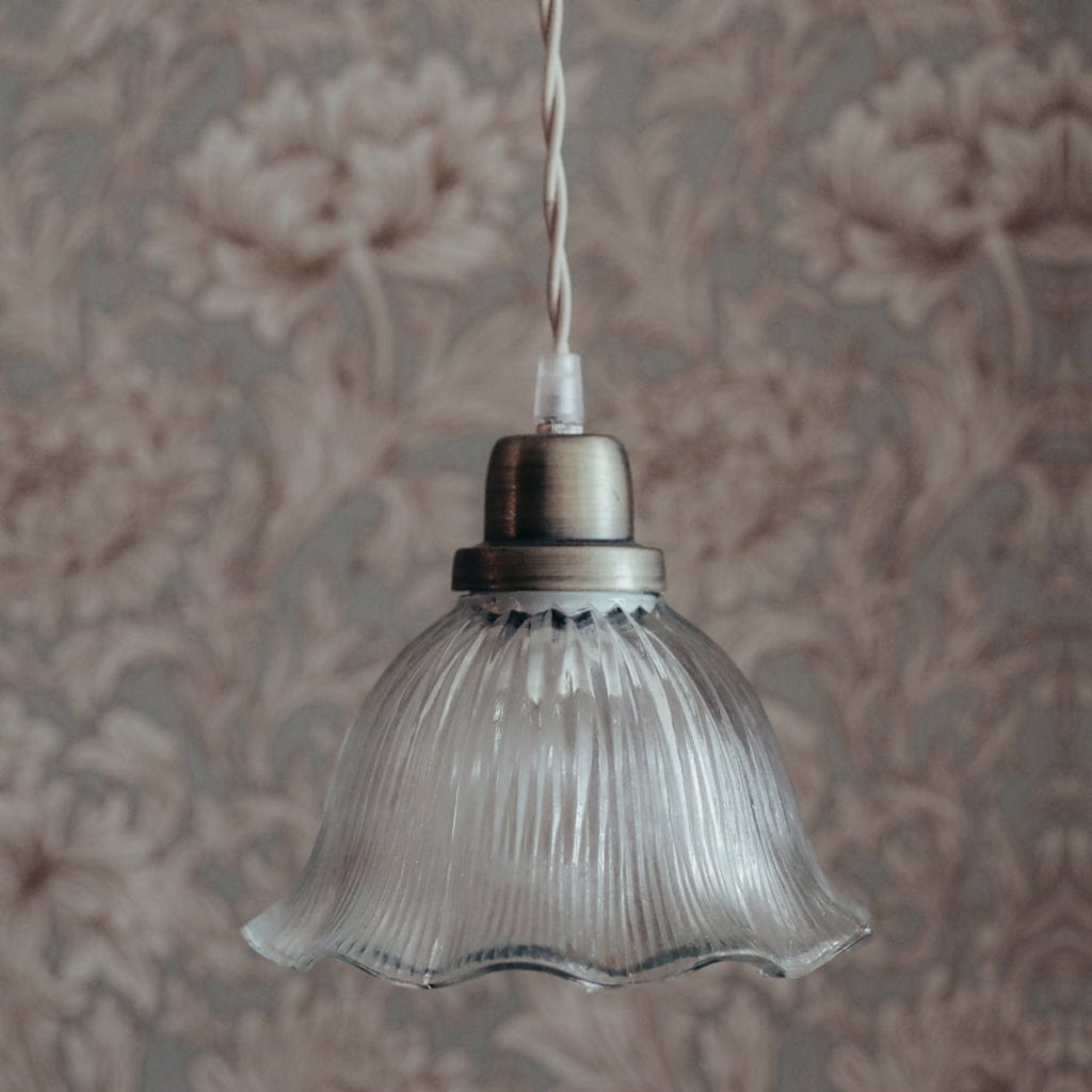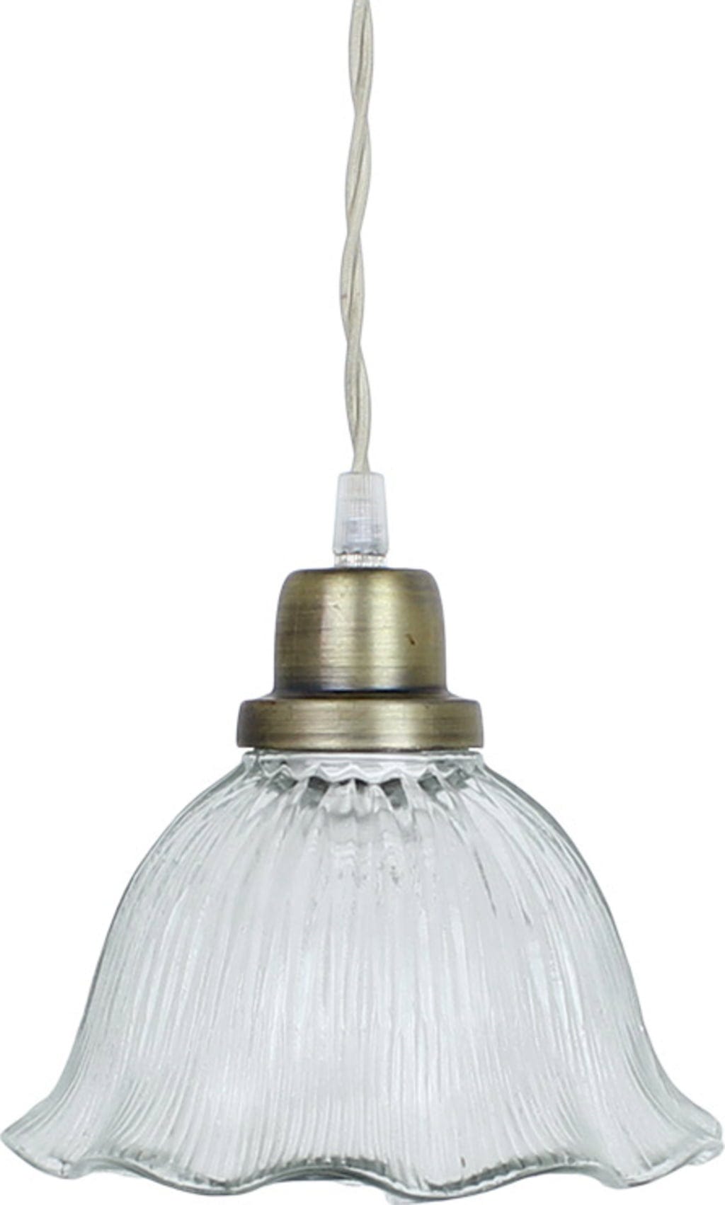 Não vais conseguir tirar os olhos deste elegante Candeeiro de Suspensão! O Abajur de Vidro trabalhado possui uma forma ondulada encantadora. A Base em Latão Antigo é o complemento ideal para o Look Vintage. O Cabo, com um comprimento de 150 cm, é revestido com Fibra Têxtil bege.